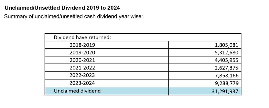 Unclaimed/Unsettled Dividend 2019 to 2024